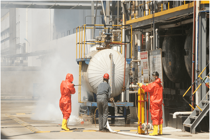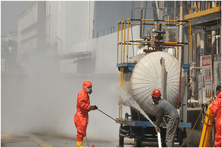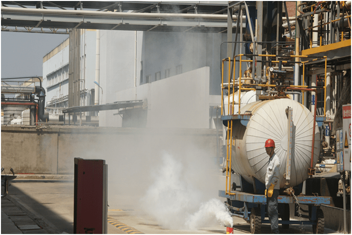 The scene disaster control team uses small liquid ammonia cylinder to control the disaster situation