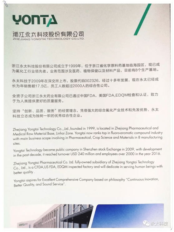 本次論壇由浙江永太科技股份有限公司等單位共同贊助。永太科技已貫通從醫(yī)藥中間體、原料藥到制劑的垂直一體化產(chǎn)業(yè)鏈,研發(fā)創(chuàng)新和工匠精神始終貫穿公司的發(fā)展歷程。作為醫(yī)藥制劑和原料藥的新秀,以及國家高新技術(shù)企業(yè),參與此次論壇,是與世界前沿技術(shù)和前瞻性發(fā)展理念的又一次親密接觸。