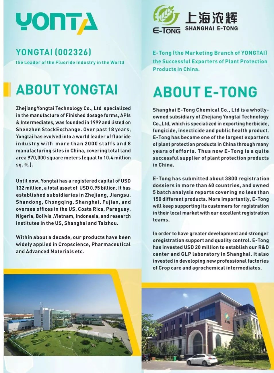 本次永太科技攜全資子公司上海濃輝化工有限公司聯(lián)袂出席,將為您呈現(xiàn)農(nóng)藥制劑、原料藥、中間體、含氟基礎(chǔ)中間體等業(yè)務(wù),并提供定制加工服務(wù)。